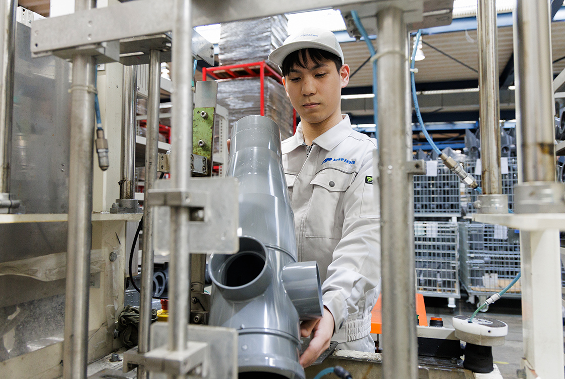 自分が一番大切にしていたテーマ「人々の支えになる職に就きたかった」という考えの元で志望しました。就職活動時に学校の先生や友人に相談する中で当社を知りました。当社で扱う配管は身近で当たり前に存在するものですが、これがないと建物を建てることができず、生活に困ってしまう大切なものです。陰ながら生活を支える必要不可欠な製品を、ぜひ自分で作ってみたいと考えました。